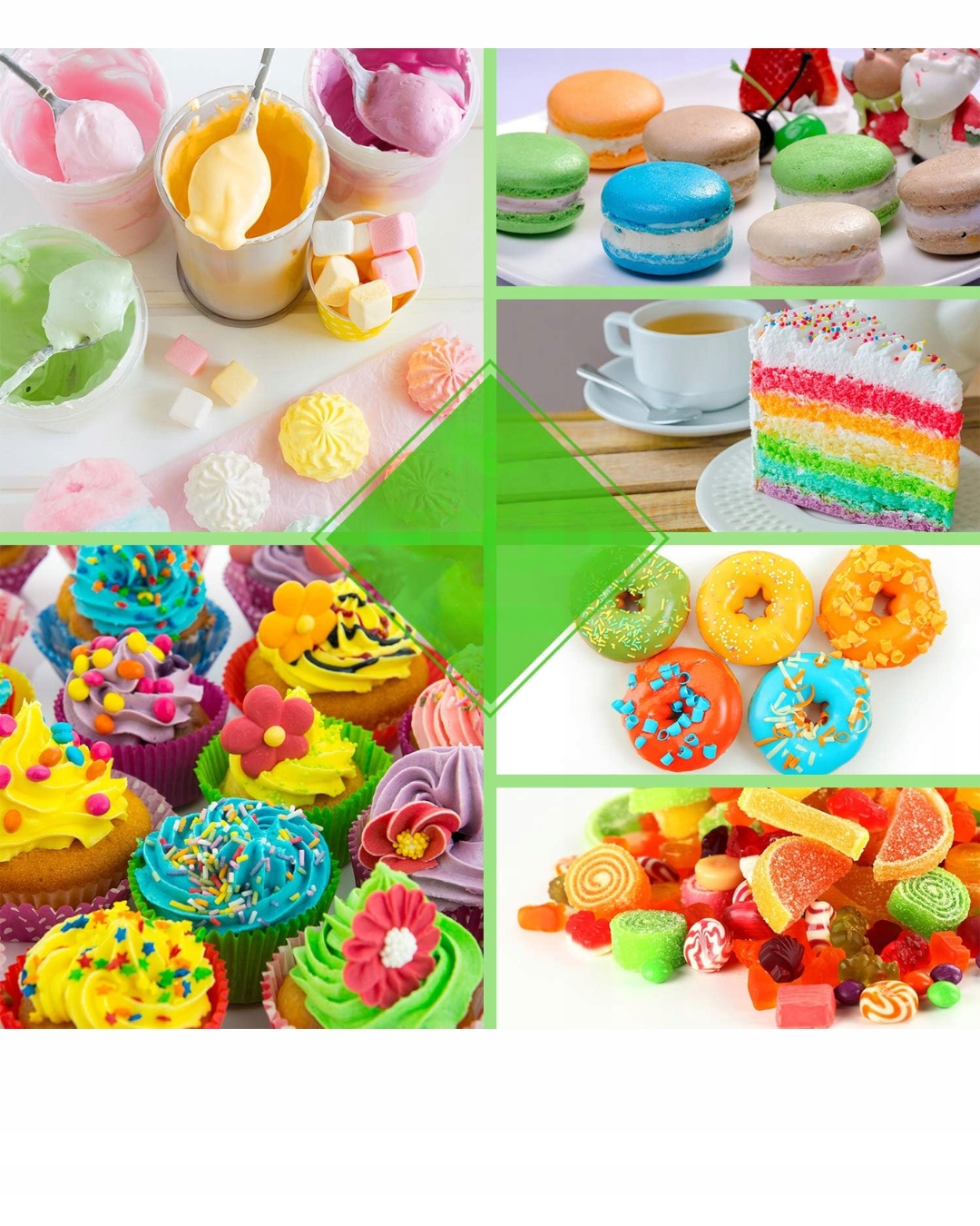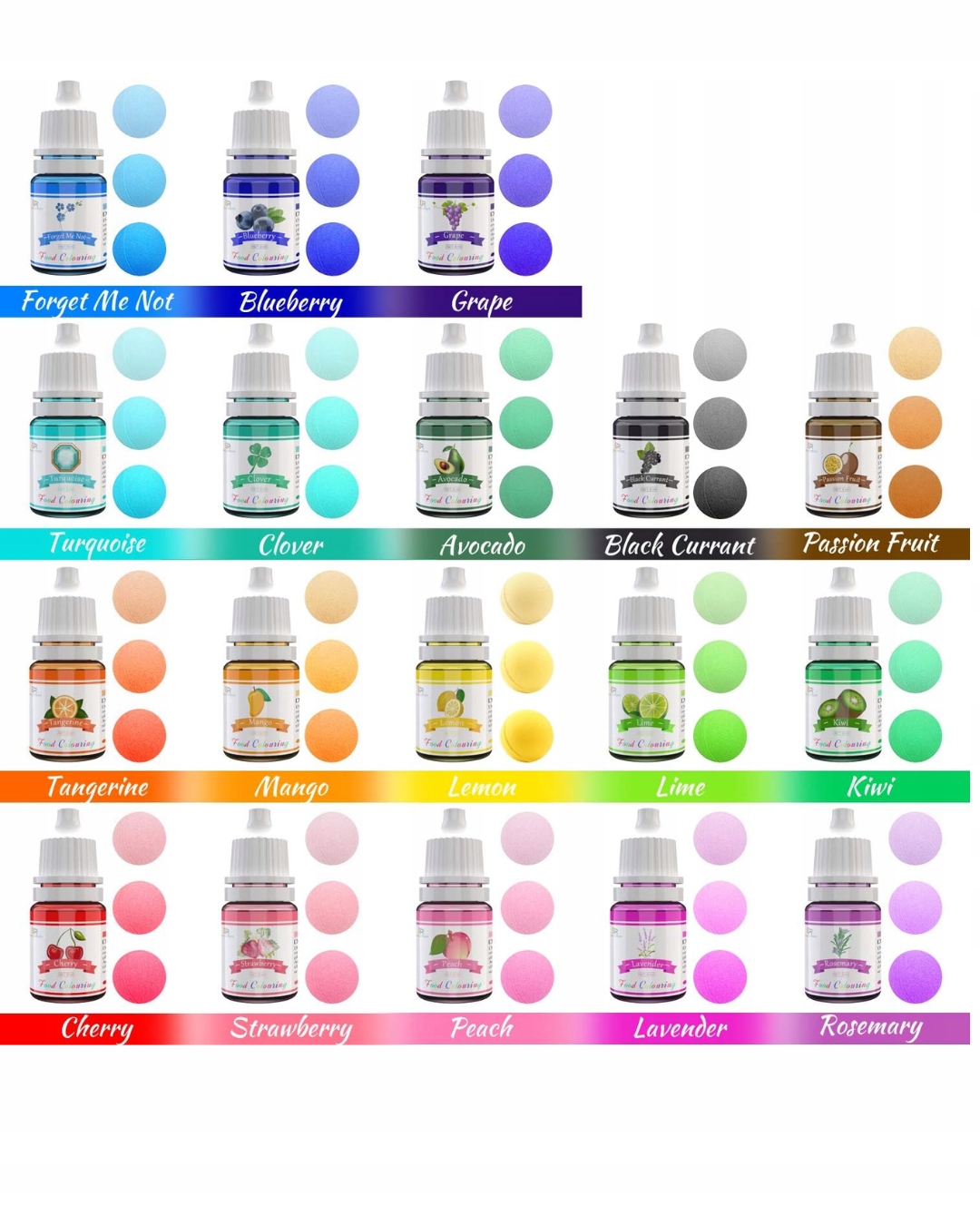 ➡️ Każda buteleczka ma 6 ml, a całkowita objętość zestawu to 108 ml płynnej kreatywności. Kolory można ze sobą mieszać, tworząc nowe odcienie i unikalne efekty dekoracyjne. Idealne do lukru, masy cukrowej, bitej śmietany czy czekolady – dają nieograniczone możliwości kulinarnej ekspresji.