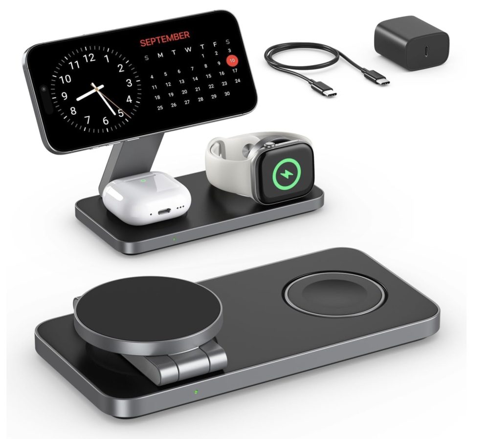 ➡️ Dzięki stacji ładującej 3 w 1 naładujesz iPhone’a, Apple Watch i AirPods w tym samym czasie. Już nie potrzebujesz wielu kabli ani gniazdek – wszystko obsługujesz jedną kompaktową ładowarką. Idealne rozwiązanie dla osób, które cenią porządek i wygodę w domu oraz podczas podróży.
