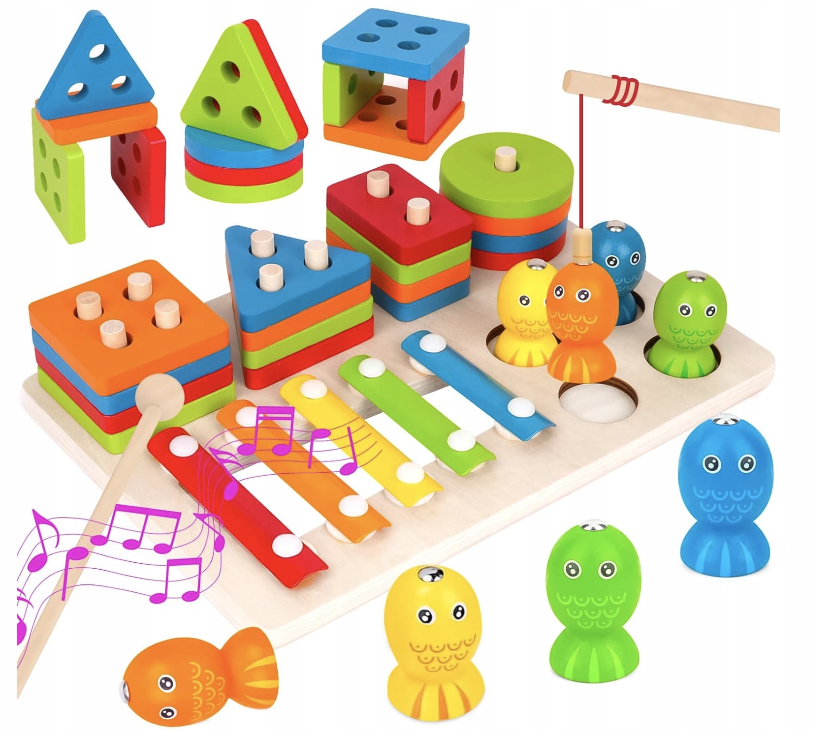 ➡️ Kolorowy ksylofon wprowadza dziecko w świat muzyki, ucząc rozpoznawania barw i dźwięków. Układanka i gra wędkarska wspierają naukę kształtów, liczenie i wczesne umiejętności rozwiązywania problemów, jednocześnie pobudzając wyobraźnię i ciekawość świata.