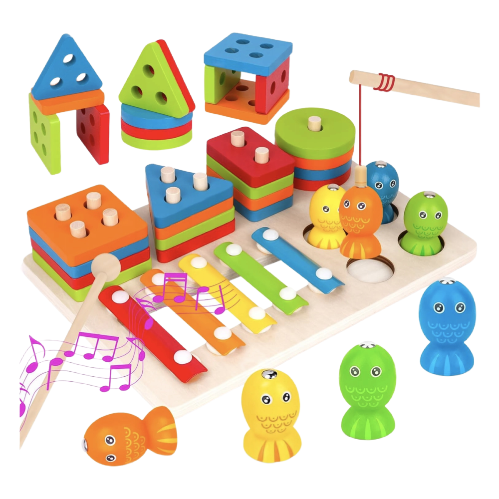 ➡️ Kolorowy ksylofon wprowadza dziecko w świat muzyki, ucząc rozpoznawania barw i dźwięków. Układanka i gra wędkarska wspierają naukę kształtów, liczenie i wczesne umiejętności rozwiązywania problemów, jednocześnie pobudzając wyobraźnię i ciekawość świata.