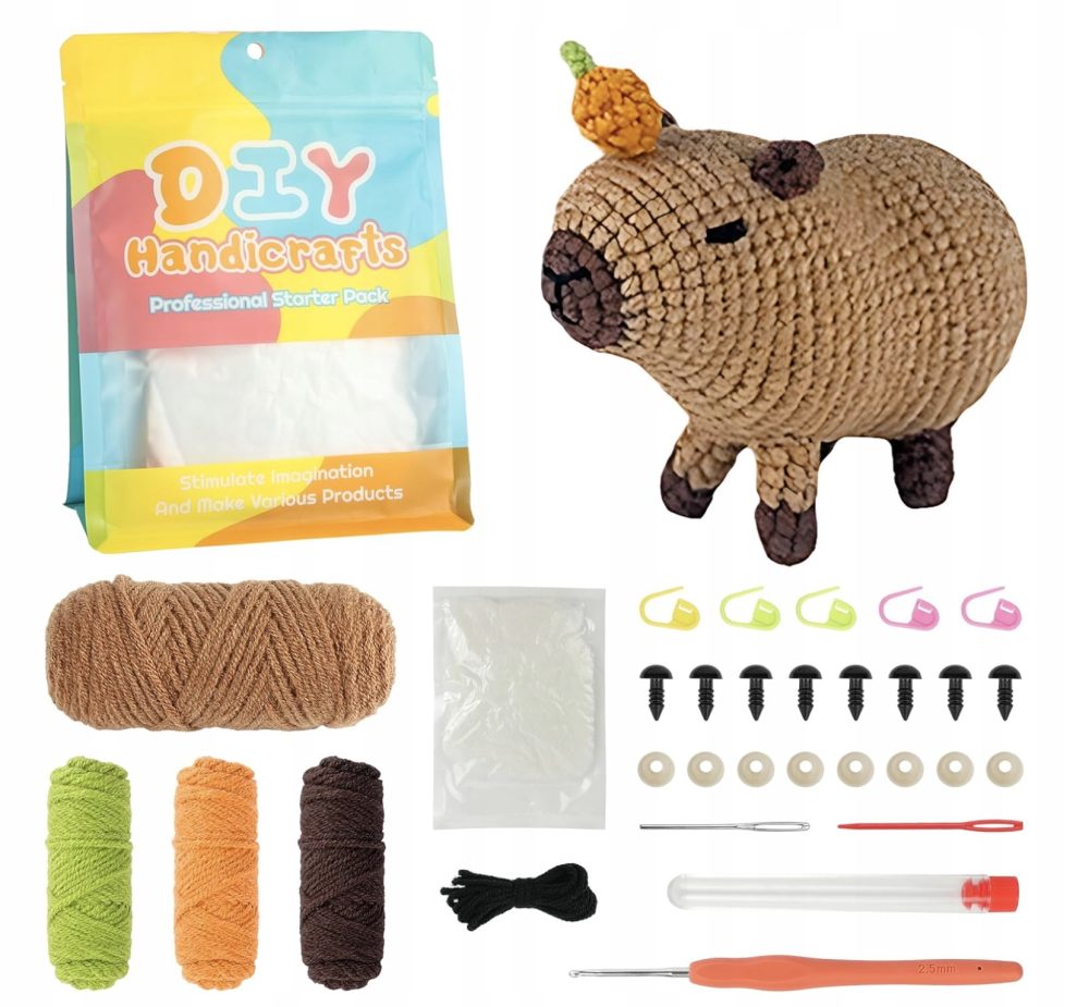 ➡️ W opakowaniu znajdziesz wszystko, czego potrzebujesz do wykonania swojej pierwszej szydełkowej kapibary: bawełnianą włóczkę, szydełko, igły, bezpieczne oczka, wypełnienie oraz akcesoria pomocnicze. To ogromna oszczędność czasu i pieniędzy oraz pewność, że każdy element będzie ze sobą idealnie współgrał.