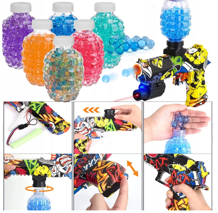 Kulki żelowe, którymi strzela karabin, są całkowicie bezpieczne w użytkowaniu. Nie powodują one żadnej szkody ani brudu.