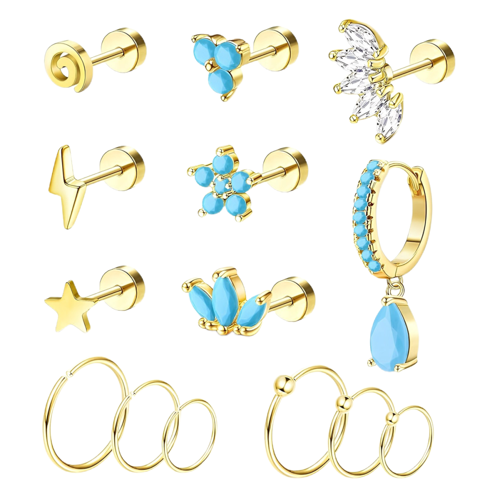 ➡️ W naszym wyjątkowym zestawie kolczyków do chrząstki znajdziesz aż 14 sztuk w różnych stylach! W tym 7 spiralnych kolczyków ze sztangą, 6 klasycznych kolczyków do chrząstki oraz 1 para eleganckich turkusowych kolczyków wiszących. Klasyczne turkusowe ćwieki to idealny akcent do każdej stylizacji, sprawiając, że wyróżnisz się w tłumie.