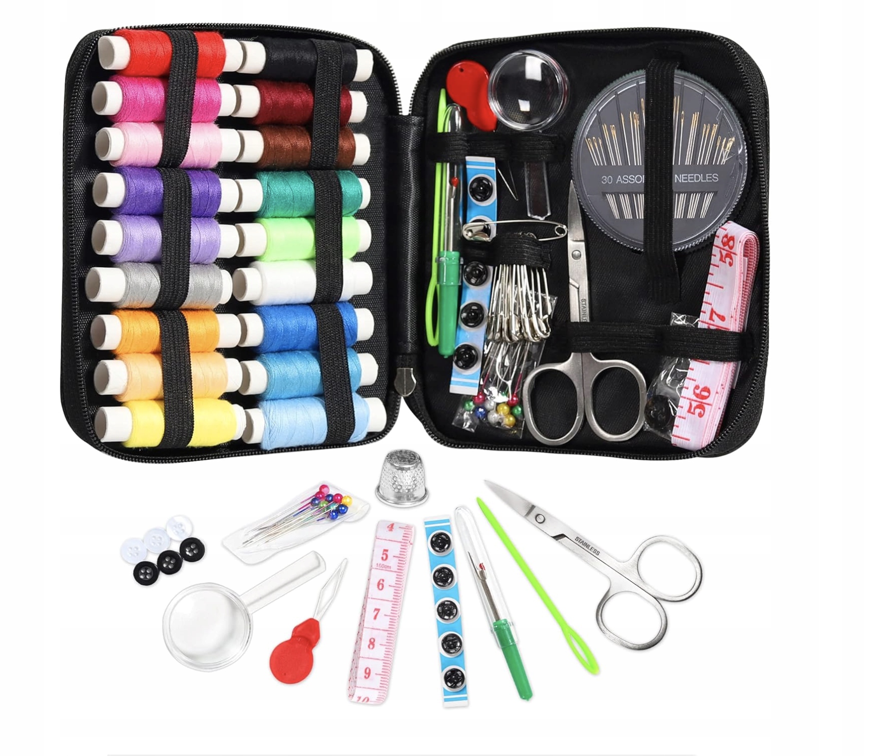 ➡️ Zestaw zawiera igły do swetra, igły z główką pereł, agrafki, metalowy naparstek, taśmę mierniczą, nawlekacz i lupę. Wszystko w jednym miejscu, byś mógł wykonać niemal każdą drobną naprawę czy projekt krawiecki bez dodatkowych zakupów.