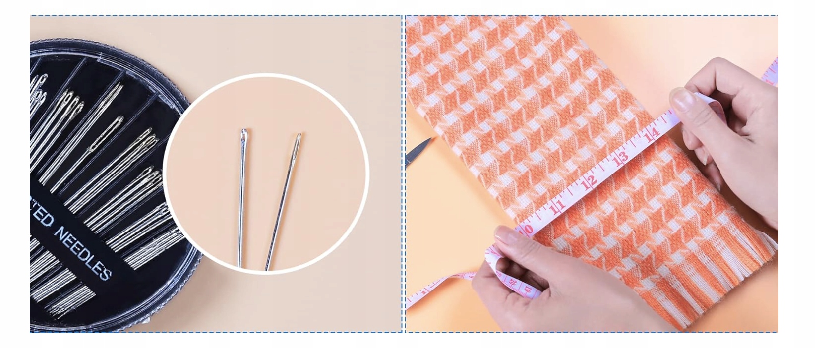 - Igły do szycia: 30 stalowych + 10 igieł z główką pereł + 1 igła do swetra
