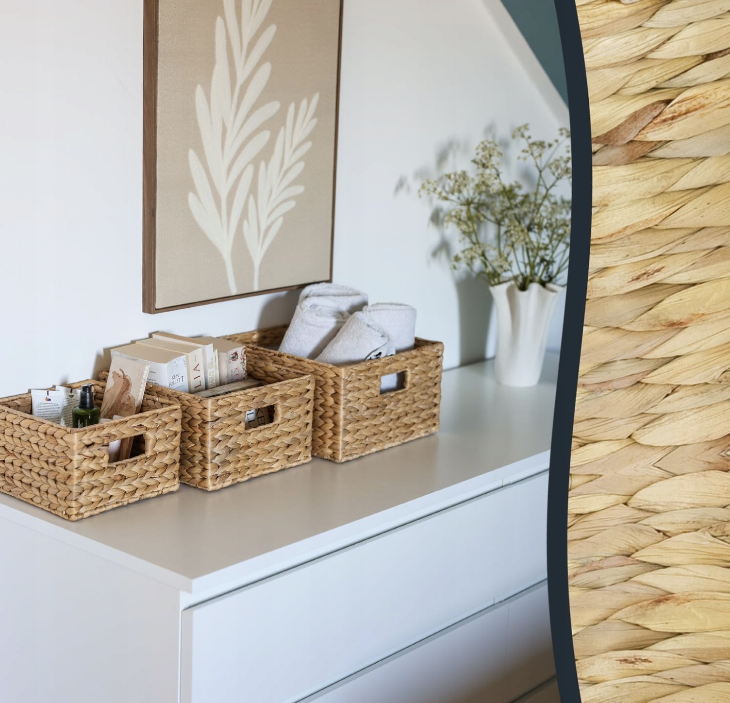 ➡️ Kosze posiadają wygodne uchwyty z hiacyntu wodnego, które ułatwiają przenoszenie i organizację przedmiotów. Teraz porządek w domu stanie się prosty i szybki, a wszystkie drobiazgi zyskają swoje miejsce.