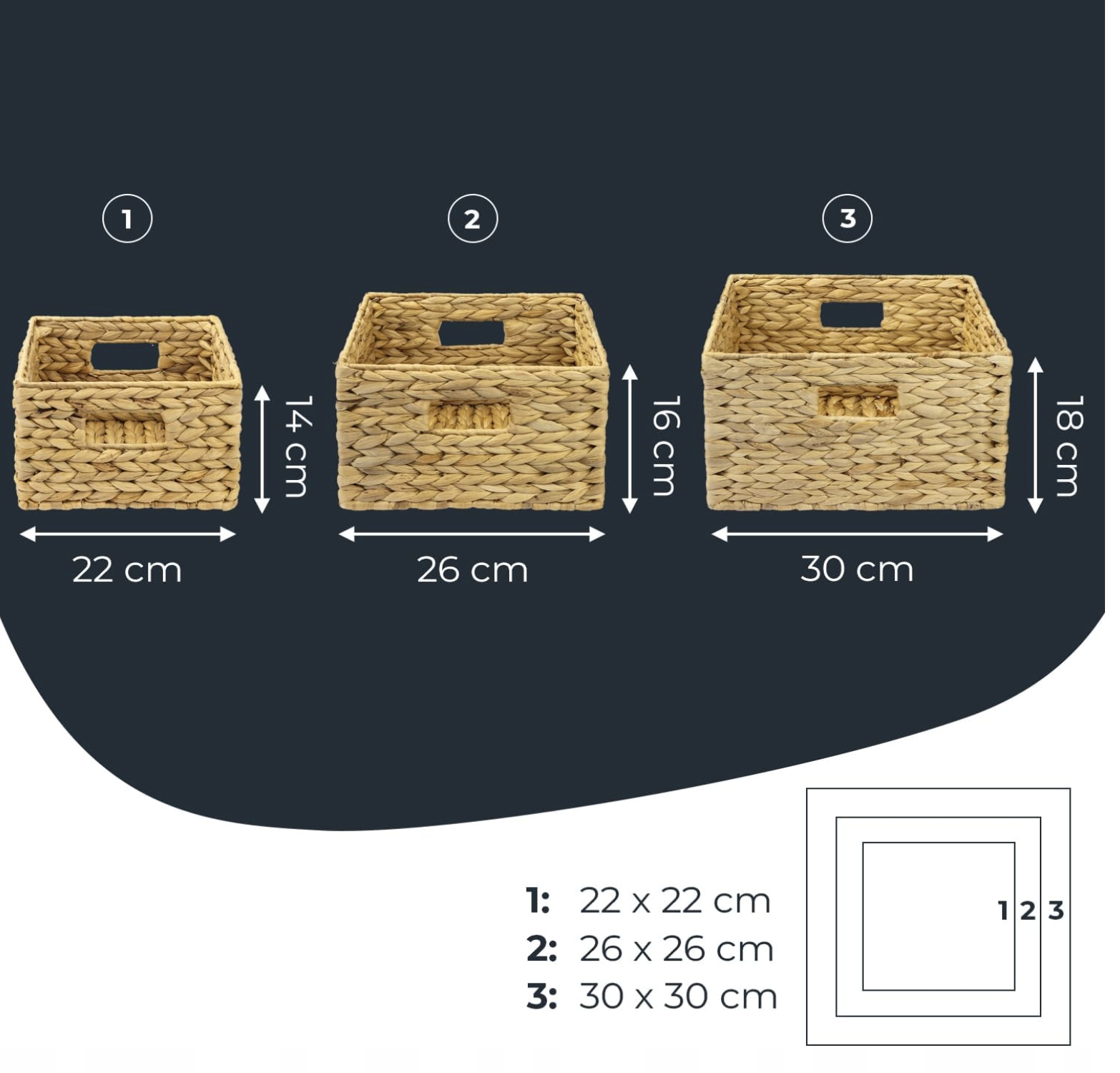 ➡️ Zestaw zawiera 3 kosze o wymiarach 22 x 22 x 14 cm, 26 x 26 x 16 cm i 30 x 30 x 18 cm. Dzięki temu idealnie dopasujesz je do regałów, szafek czy półek, a różne rozmiary pozwalają na przechowywanie drobnych i większych przedmiotów, utrzymując porządek w całym domu.