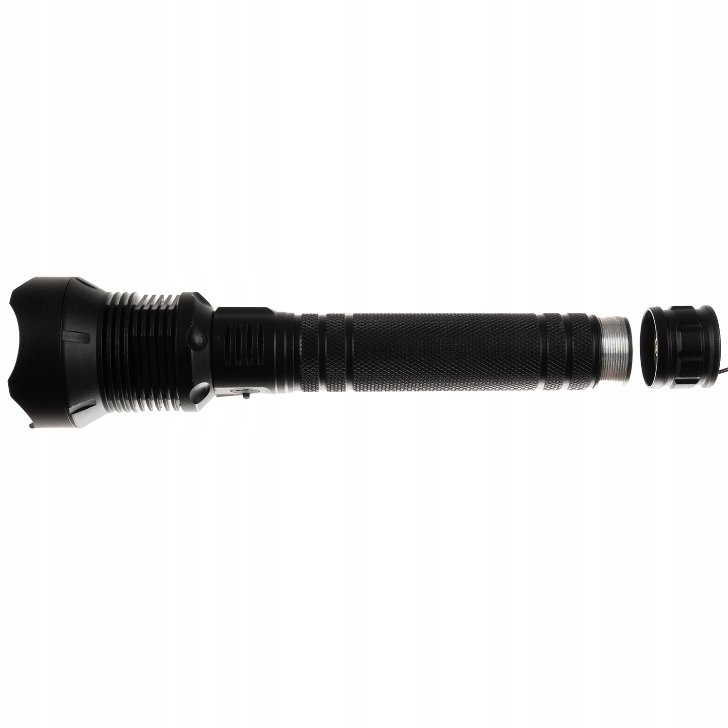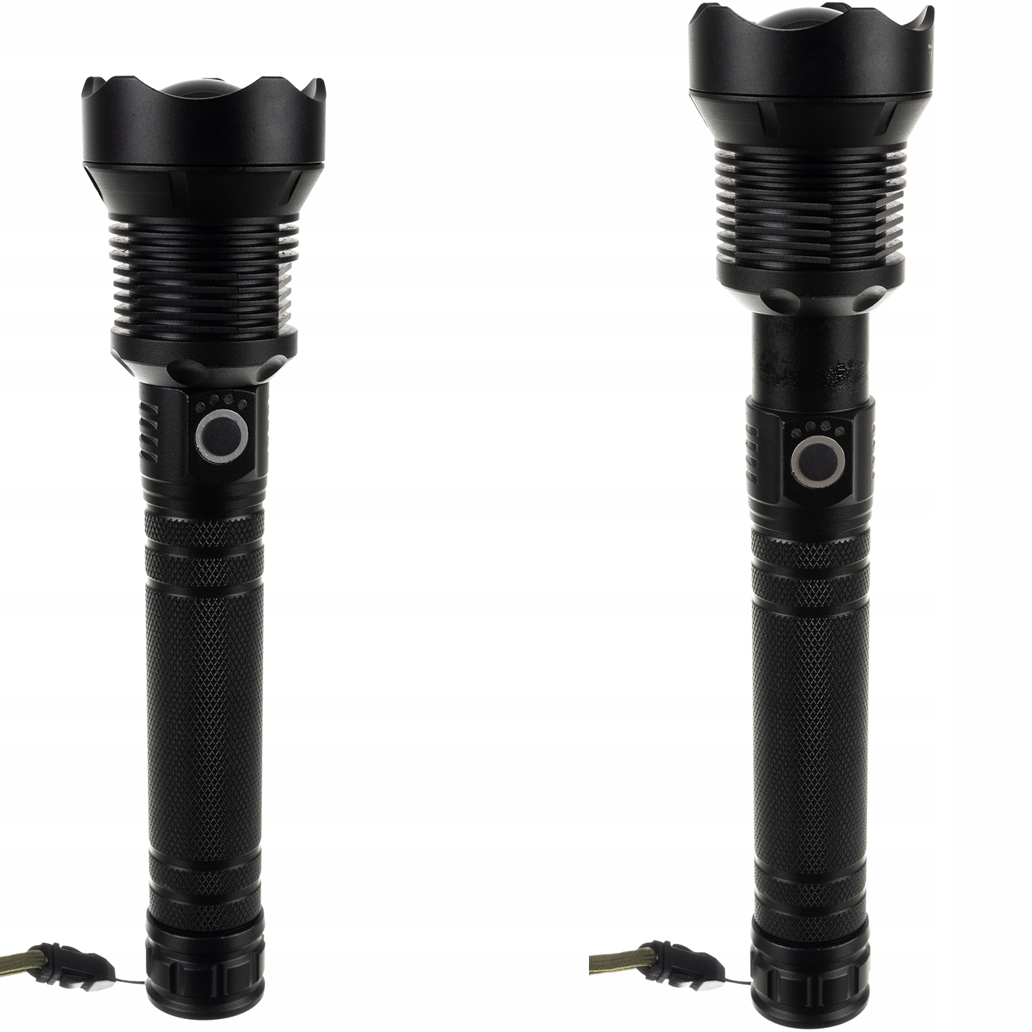 - ➡️ SPECYFIKACJA – materiał: aluminium; długość strumienia świetlnego: 500 m; dioda P70; 3 tryby świecenia; akumulator: 2 x 26650 mAh; moc: 4500 lumenów; wymiary: 25 x 6 cm; waga: 0,504 kg; waga w opakowaniu: 0,700 kg.