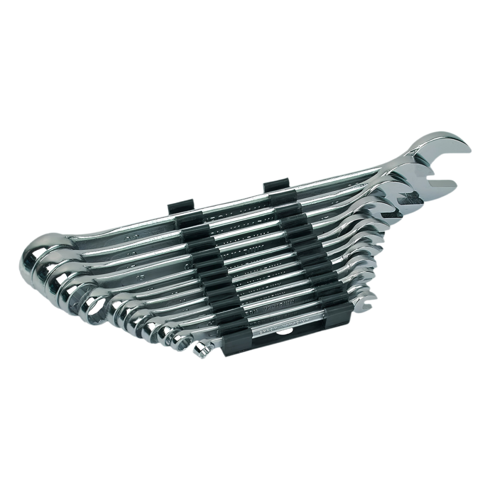 Zestaw składa się z 12 kluczy płasko-oczkowych o rozmiarach od 6 do 22 mm, wykonanych ze stali chromowo-wanadowej, co gwarantuje wytrzymałość, trwałość i długą żywotność bez problemów, takich jak rdza. Klucze są polerowane, co dodaje im estetycznego wyglądu.
