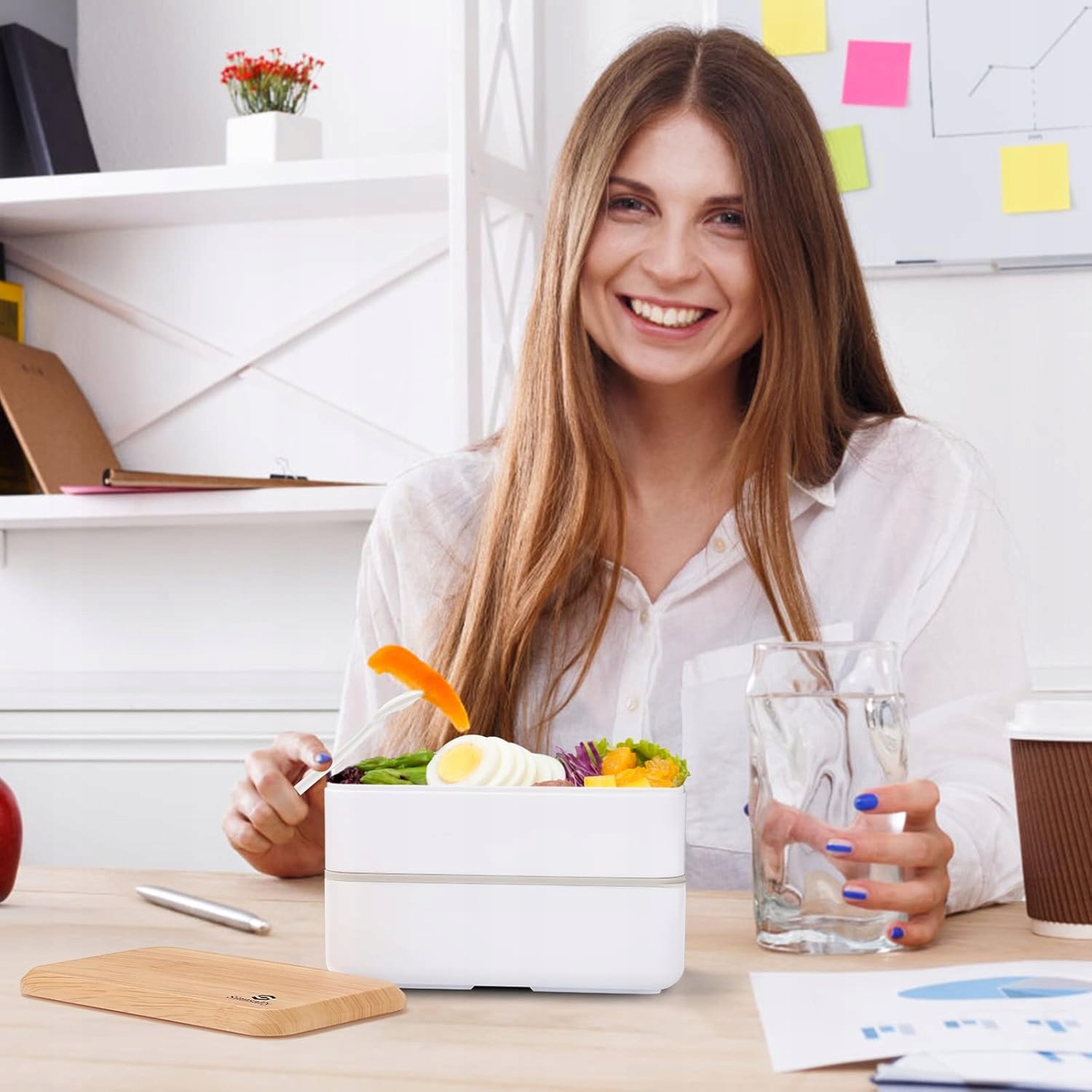 ➡️ Każda warstwa pudełka ma oddzielną, szczelną pokrywę zaprojektowaną tak, aby zapobiegać wyciekom. Mocne zamknięcie gwarantuje, że Twój lunch pozostanie na swoim miejscu, nawet jeśli włożysz pojemnik do torby lub plecaka. Możesz cieszyć się ulubionymi potrawami bez obaw o bałagan!
