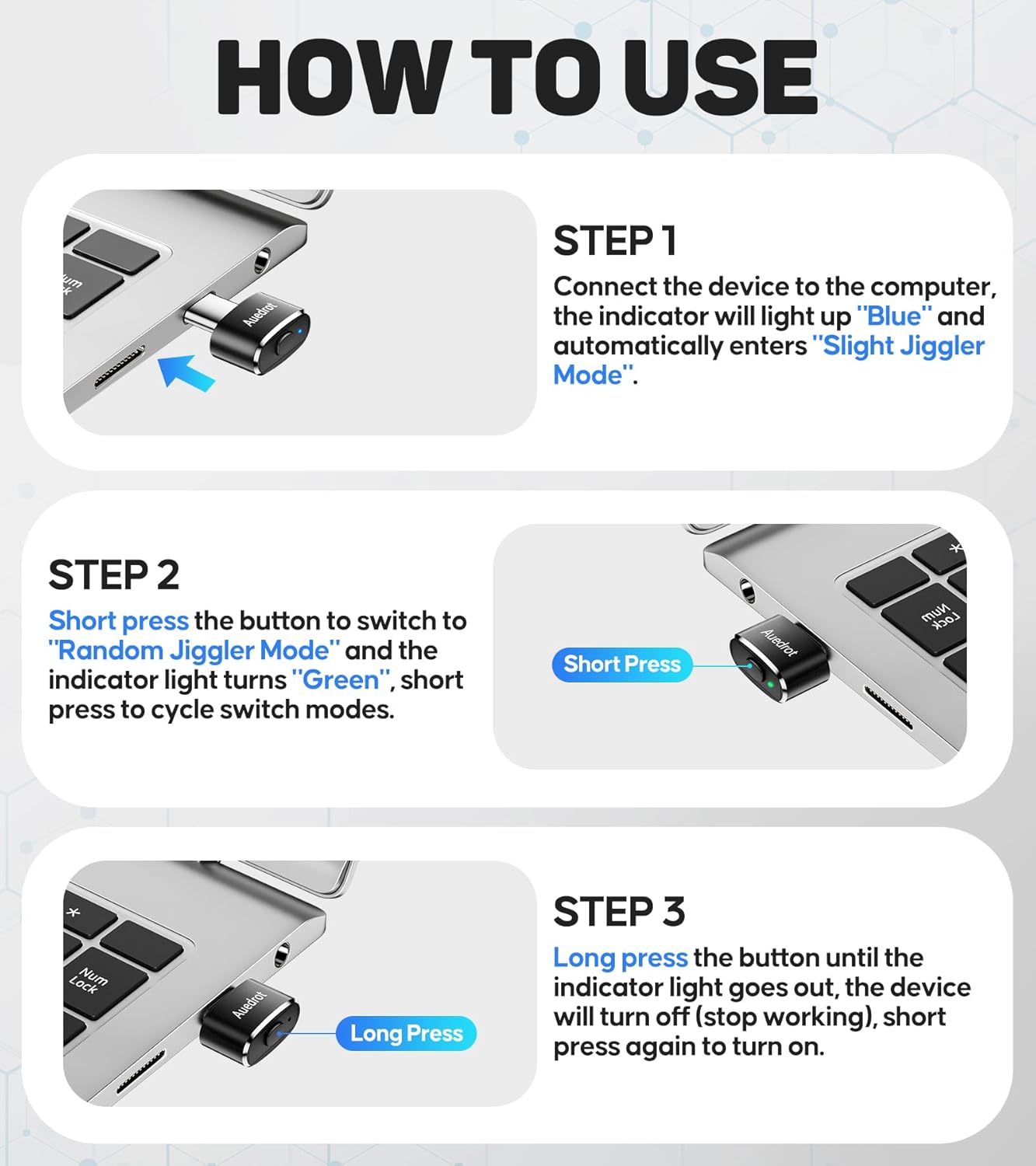 ➡️ Urządzenie oferuje dwa zaawansowane tryby jigglera: lekki tryb przesuwający wskaźnik o 1-2 piksele bez wpływu na normalne użytkowanie, oraz losowy tryb poruszający kursor nieregularnie. Możesz wybrać dokładnie to, czego potrzebujesz, aby dostosować pracę komputera do swoich wymagań i preferencji.