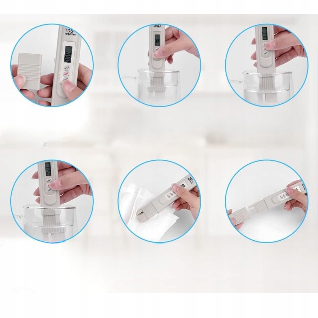 - Zakres pomiaru TDS: 0–999 ppm (rozdzielczość 1 ppm), 1000–9990 ppm (rozdzielczość 10 ppm)