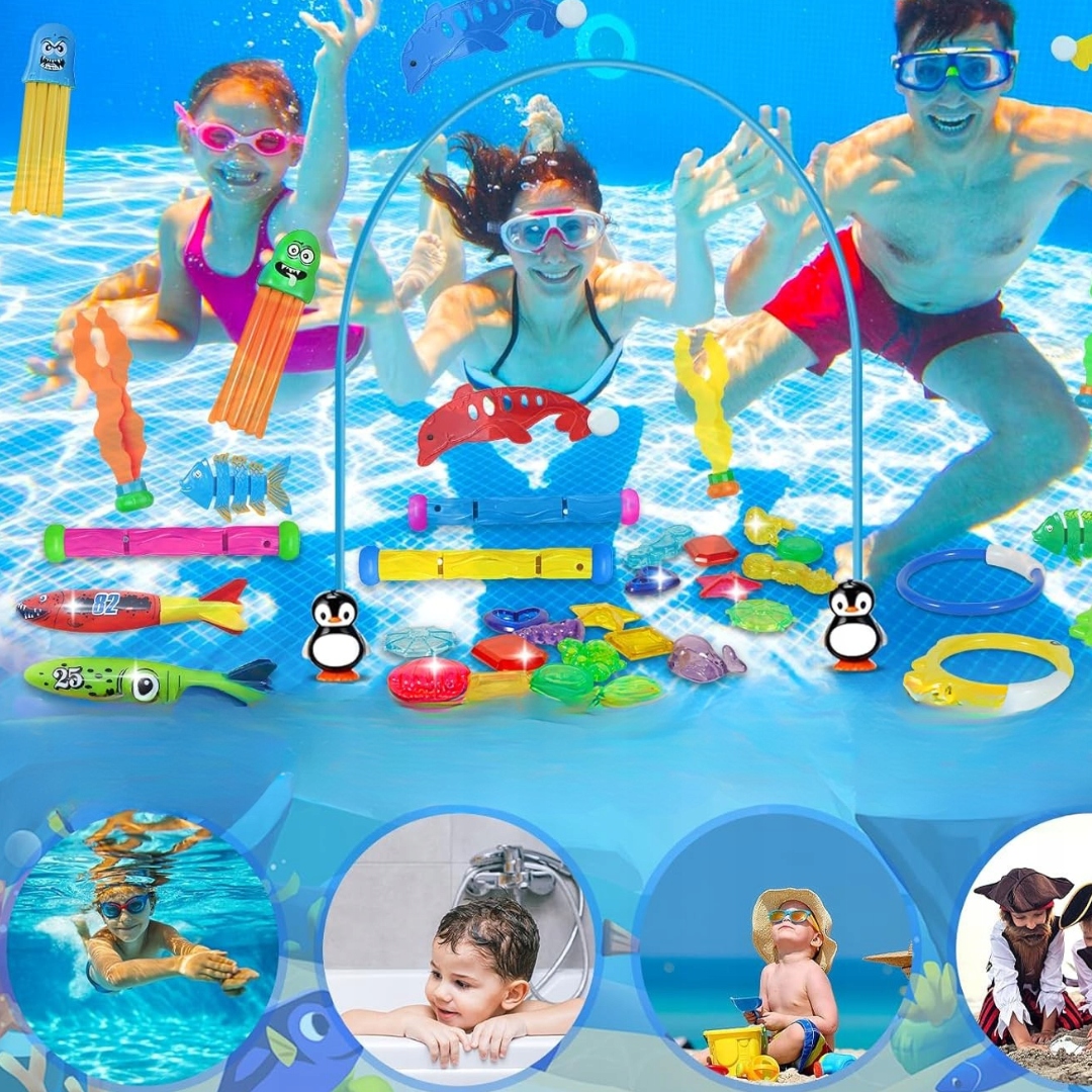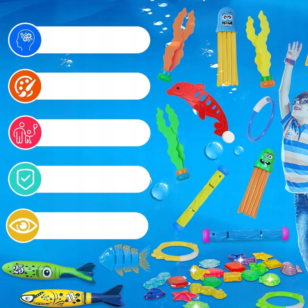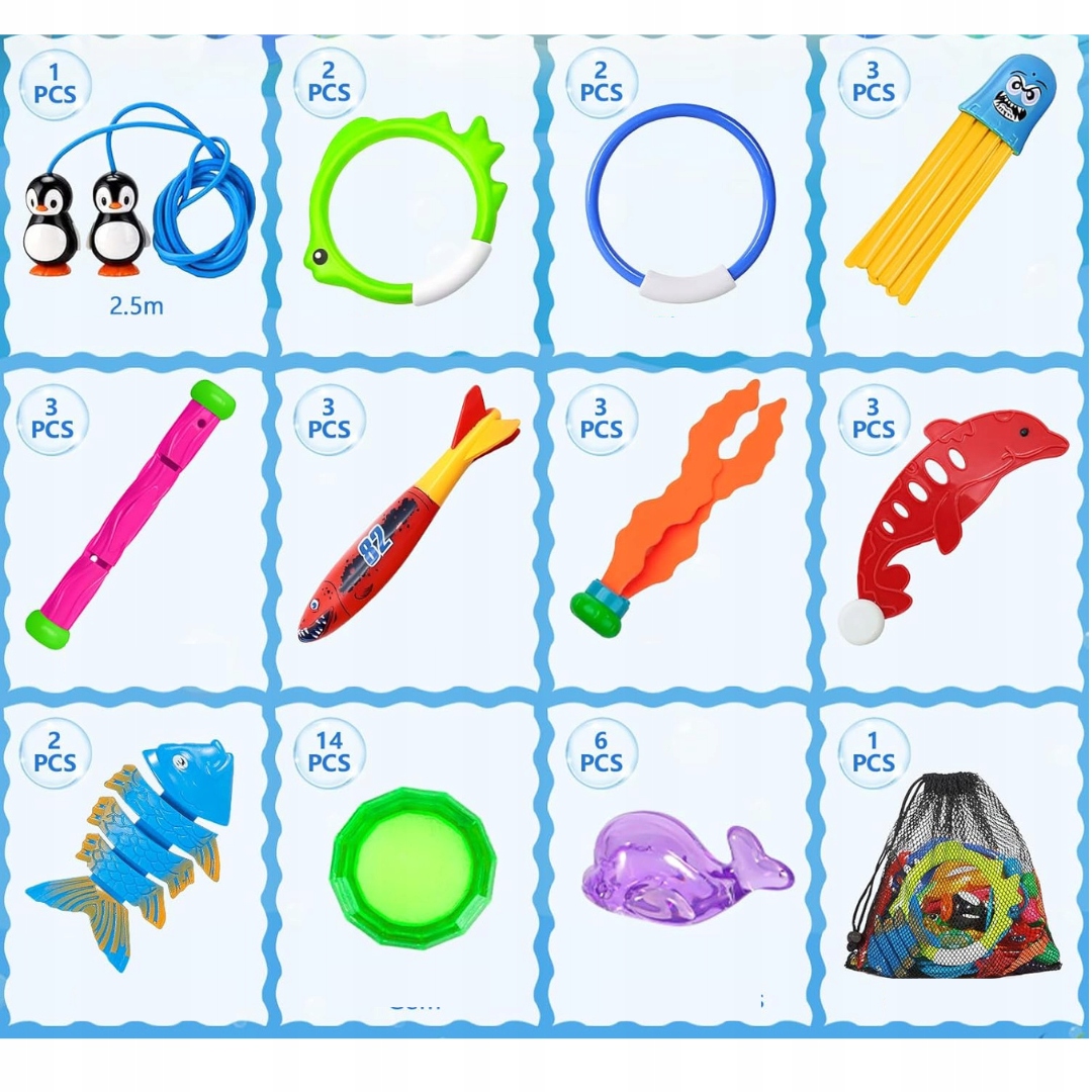 ➡️ Oferujemy wyjątkowy zestaw 43 kolorowych zabawek do nurkowania, które zapewnią Twoim dzieciom nieskończoną zabawę w basenie! Idealne na letnie dni, imprezy przy basenie oraz naukę pływania – zestaw został stworzony z myślą o bezpieczeństwie i radości najmłodszych. Dzięki żywym kolorom zabawki są łatwe do zauważenia i wyłowienia pod wodą, co dodatkowo zwiększa atrakcyjność zabawy.