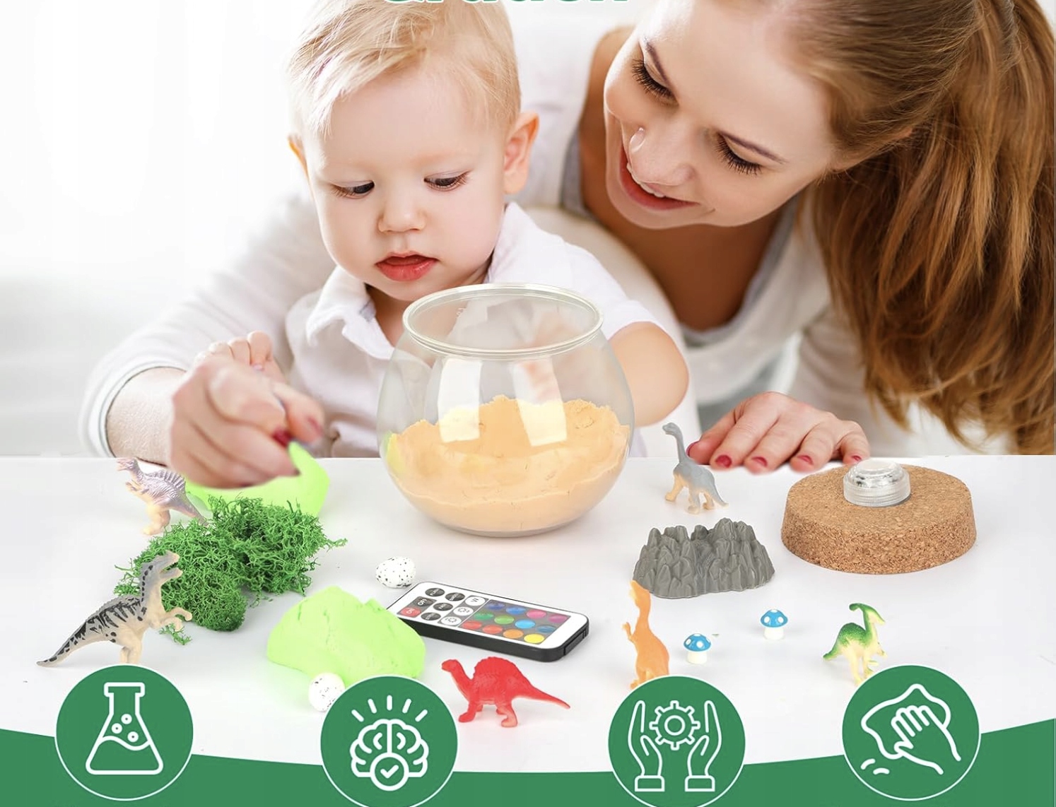 - Dołączone komponenty: Lampka nocna LED 13 kolorów z pilotem, 5 miniatur dinozaurów, miniatury jaj, miniatury ogrodów skalnych, magiczny piasek, zakonserwowany mech, akcesoria dekoracyjne