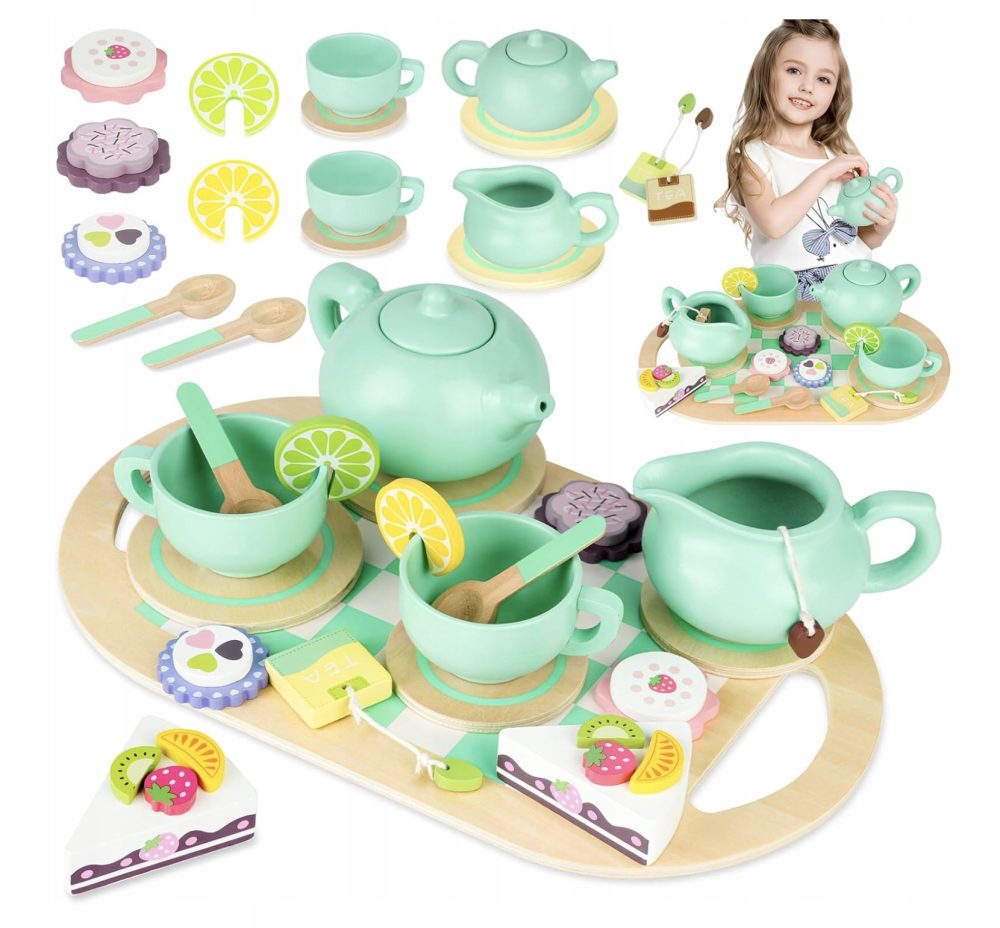 ➡️ W komplecie znajdziesz: 2 czajniki, 2 filiżanki, 4 podstawki, 2 łyżki, 2 torebki herbaty, ciasto owocowe, 2 plasterki cytryny, 3 ciasteczka i drewnianą tacę – wszystko, co potrzebne do udanej zabawy.