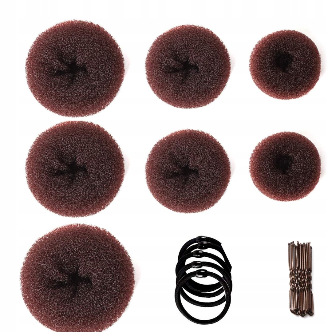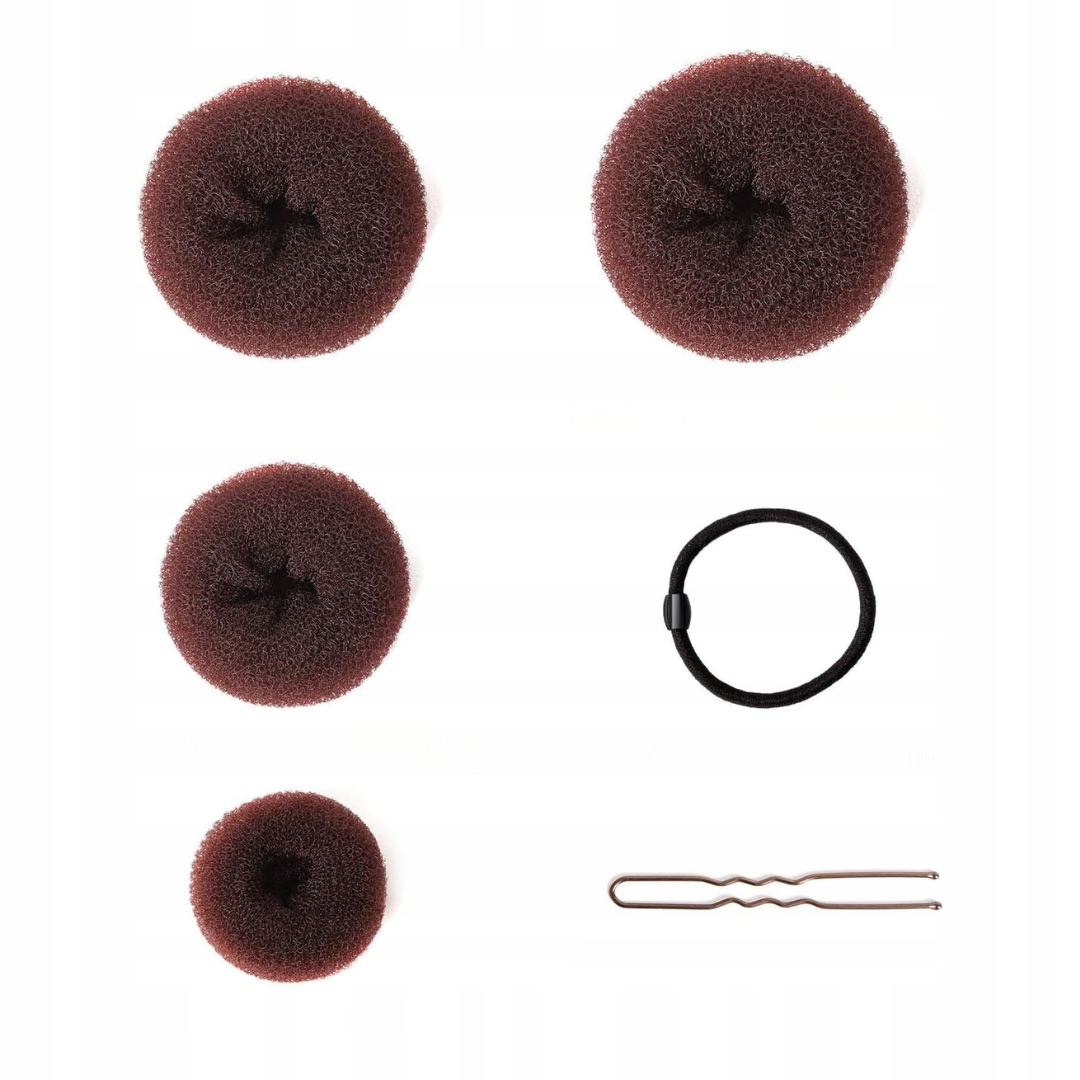 - Ilość w zestawie: 7 sztuk maszynek do robienia koków (bardzo duży, 2 duże, 2 średnie, 2 małe), 5 gumek, 20 spinek do włosów