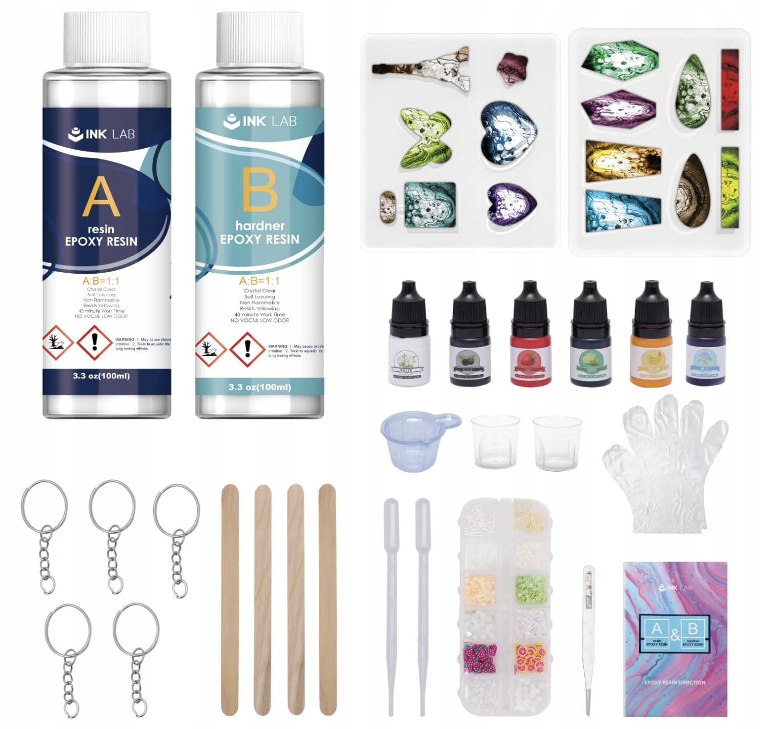 Żywica, utwardzacz, 6 pigmentów, 6 rękawiczek, kubki pomiarowe, patyczki, łyżki, pęseta, 2 formy silikonowe, 5 breloków, cekiny, instrukcja