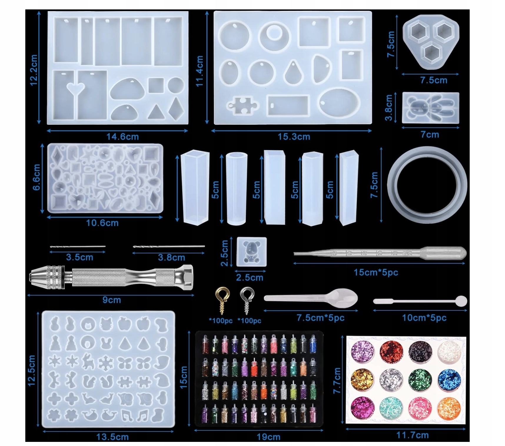 - W zestawie: 13 foremek silikonowych, 200 śrub oczkowych, 60 brokatów, 5 mieszadełek, 5 upperów, 5 plastikowych łyżek, ręczne wiertło spiralne + 2 bity Twist