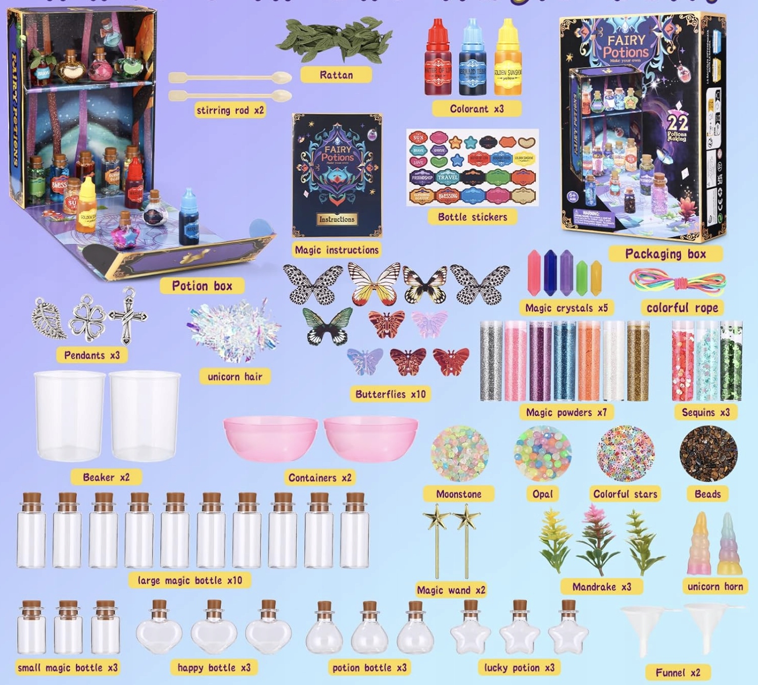 ➡️ W komplecie znajdziesz 22 butelki na eliksiry, 10 butelek z brokatem, 3 gotowe mikstury, 2 miski, 2 miarki, 2 lejki, 25 etykiet, błyszczące motyle, kolorowe gwiazdki i wiele innych elementów. Wszystko, czego potrzeba do stworzenia prawdziwej pracowni czarodzieja!