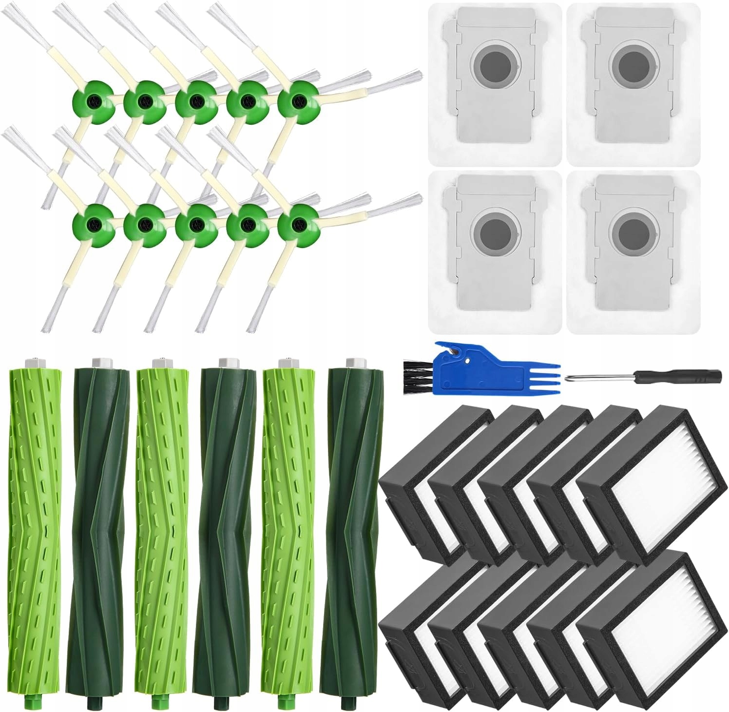 ➡️ Ten zestaw to aż 3 gumowe szczotki główne, 10 wysokowydajnych filtrów HEPA, 10 szczotek bocznych i 4 worki na kurz. Dzięki temu zapewnisz robotowi skuteczne usuwanie kurzu, włosów i brudu z każdego zakamarka. Wszystkie elementy są łatwe w montażu i zaprojektowane specjalnie dla Twojego modelu Roomba, co zapewnia maksymalną kompatybilność i niezawodność.