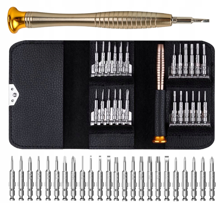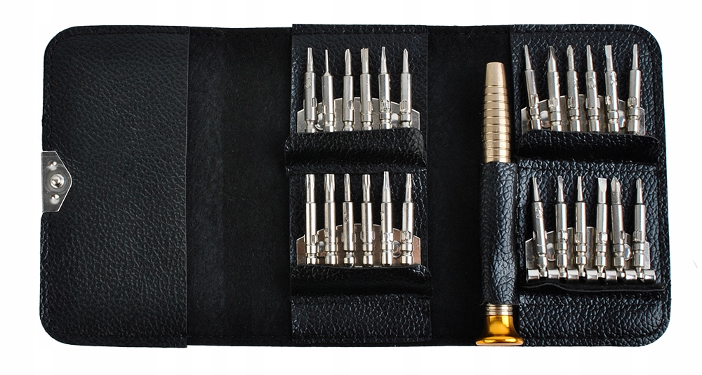 - ➡️25 ELEMENTÓW – w zestawie znajdują się 24 końcówki oraz uchwyt bazowy, co tworzy komplet umożliwiający serwisowanie oraz naprawę większości drobnych urządzeń elektronicznych dostępnych na rynku.